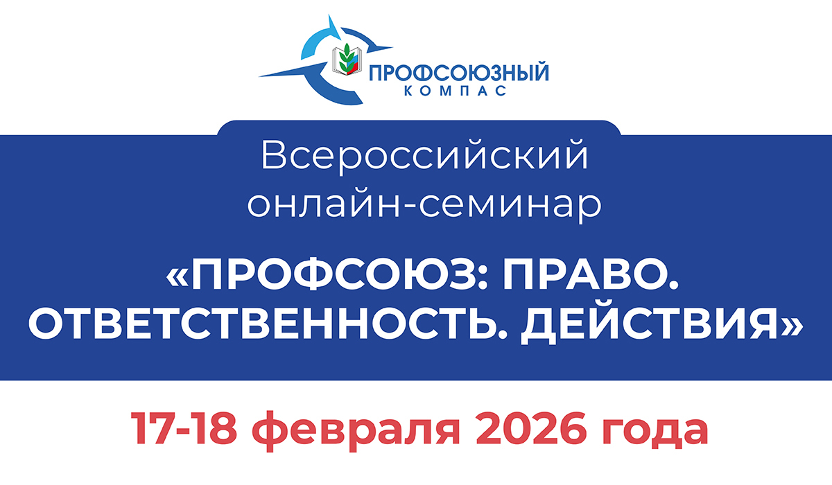 17—18 февраля состоится Всероссийский онлайн-семинар «Профсоюзный компас» по теме «Профсоюз: Право. Ответственность. Действия». К участию приглашаются лидеры и активисты Общероссийского Профсоюза образования — представители региональных (межрегиональных), территориальных и первичных профсоюзных организаций (юридических лиц), территориальных профсоюзных организаций (без образования юридических лиц), первичных профсоюзных организаций.